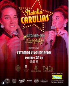 El Domingo 21 de diciembre a las 21 hs en el Teatro Juan de Vera, Natalia Carulias presenta su unipersonal de stand up “Estamos vivos de pedo”. En este espectáculo, Natalia se ríe de las cosas cotidianas que le pasan a los de su generación. Mujeres que trabajan mientras crían a sus hijos e hijas como pueden, que no entienden de redes, que se olvidan las cosas.