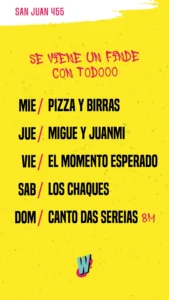 MIÉRCOLES | Arrancamos con Pizza y Birras para cortar la semana. JUEVES | Show en vivo de Migue y Juanmi. VIERNES | ¡Llega el momento esperado! SÁBADO | Fiesta total con Los Chaques. DOMINGO | Especial 8M: Canto das Sereias.
