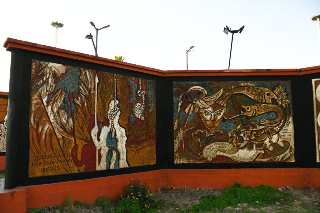También se incluyen elementos que hacen alusión a las luchas populares, como la de un grupo de docentes y profesores marchando mientras portan la bandera Argentina. En otra de las obras se aprecia las figuras de tres personas, desplomándose al suelo, con los brazos en alto, implorando clemencia y acompañados en la parte superior por la frase “Nunca Más”, esto en alusión a la última Dictadura Cívico-Militar que tuvo lugar en la Argentina entre los años 1976 y 1983. Este período se caracterizó por la represión sistemática de la oposición política y la violación de los derechos humanos, incluyendo la desaparición forzada de personas, la tortura y el asesinato.